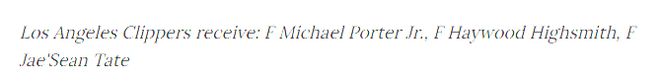 潛在交易方案:快船隊獲得邁克爾·波特二世,海伍德·海史密斯,杰肖恩·泰特;休斯頓火箭得到克里斯·保羅;籃網(wǎng)獲得約翰·柯林斯,博格丹·博格達(dá)諾維奇,科比·布朗,以及洛杉磯城2031年首輪選秀權(quán)(前四保護(hù))