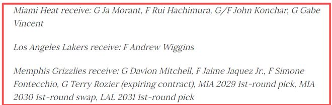 如果追求字母哥失敗,那么熱火可能另尋良將,可以與湖人、灰熊達(dá)成三方交易,得到莫蘭特!潛在交易方案為:熱火獲得——賈·莫蘭特、八村塁、約翰·孔查爾、蓋布·文森特;湖人獲得——威金斯;孟菲斯灰熊獲得——達(dá)維恩·米切爾、海梅·哈克斯二世、西蒙·豐特基奧、特里·羅齊爾(合同到期)、來自熱火的2029年首輪選秀權(quán)、2030年首輪交換、來自湖人的2031年湖人首輪選。