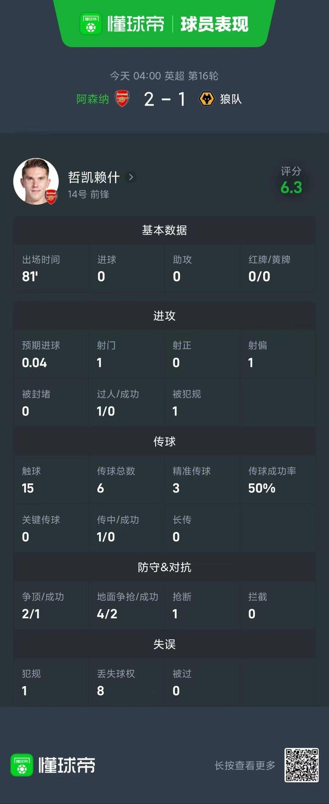 本場比賽,槍手前鋒哲凱賴什首發(fā)出戰(zhàn)81分鐘,1次射門0次射正,在場上僅觸球15次。其他數(shù)據(jù)方面,哲凱賴什0次成功過人,6次傳球3次成功,8次丟失球權(quán)。